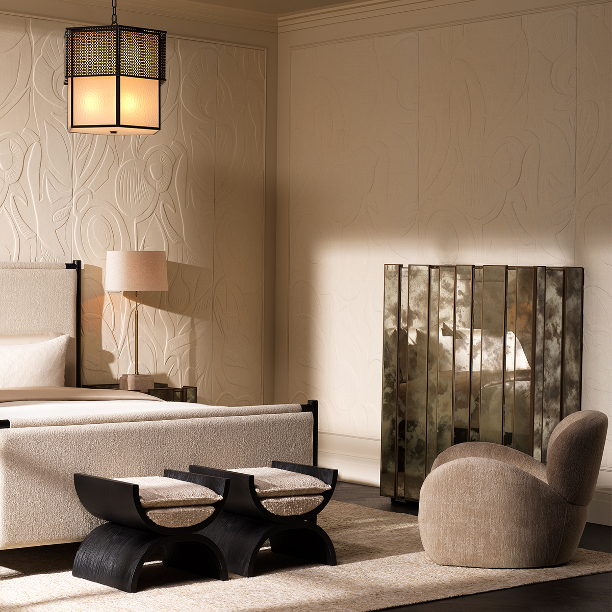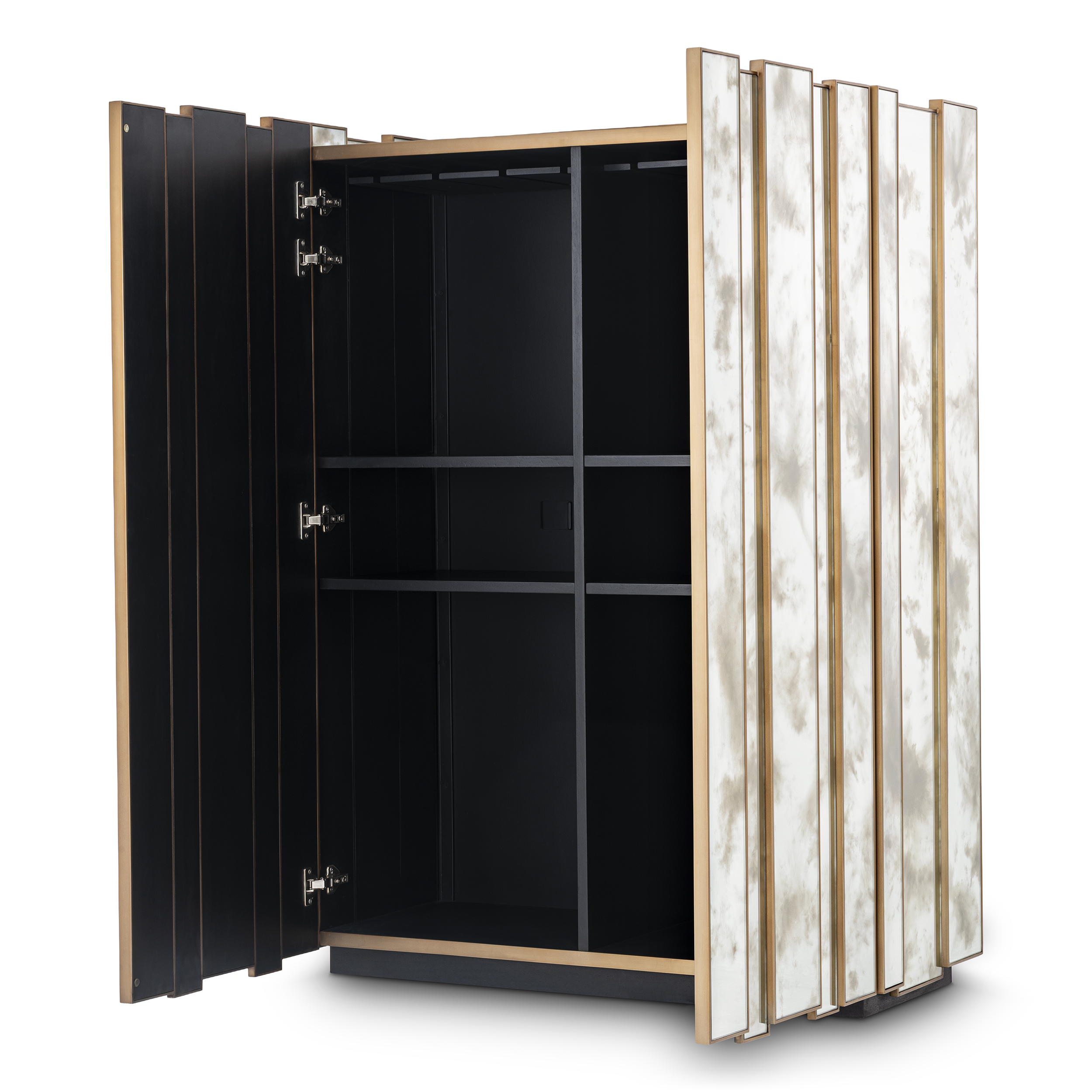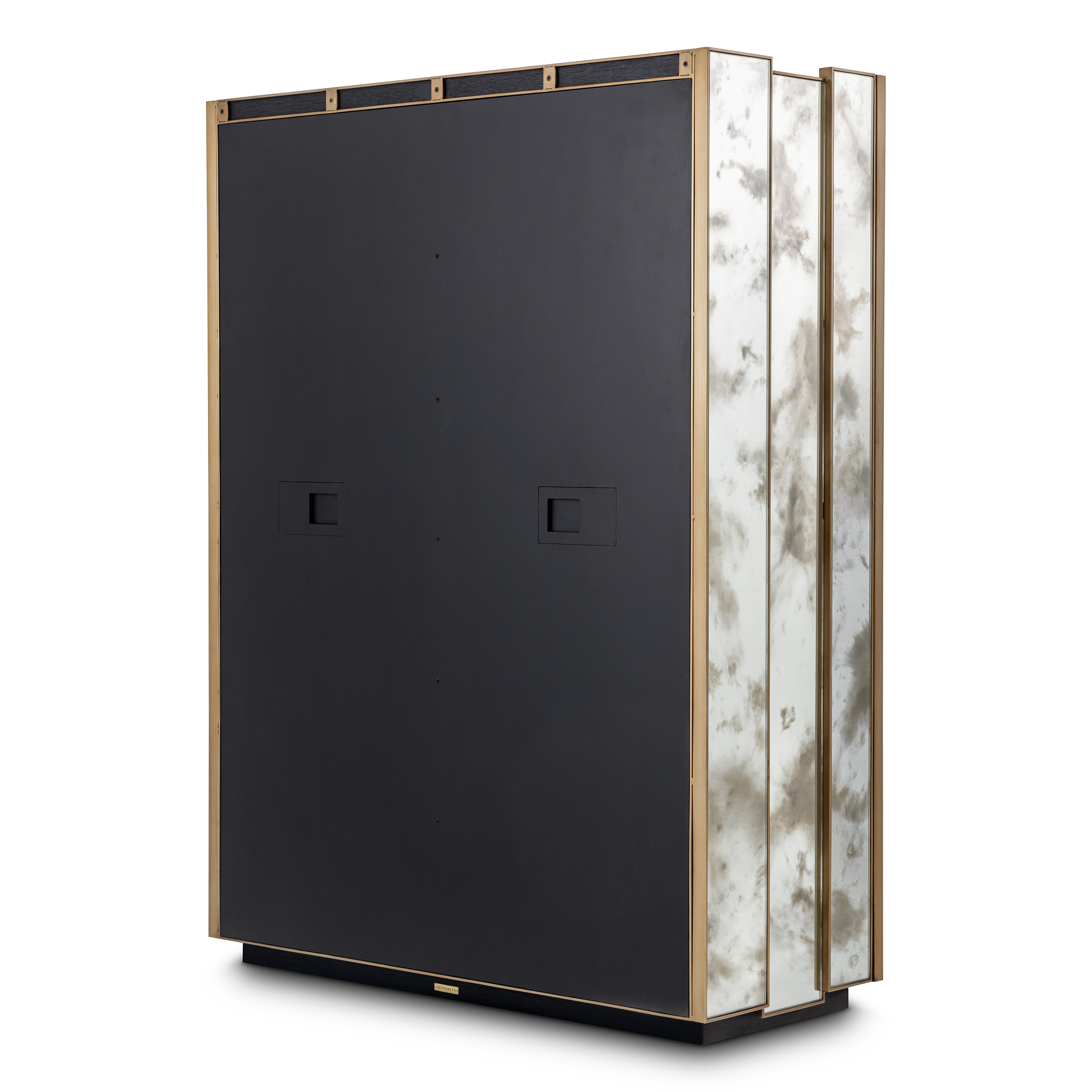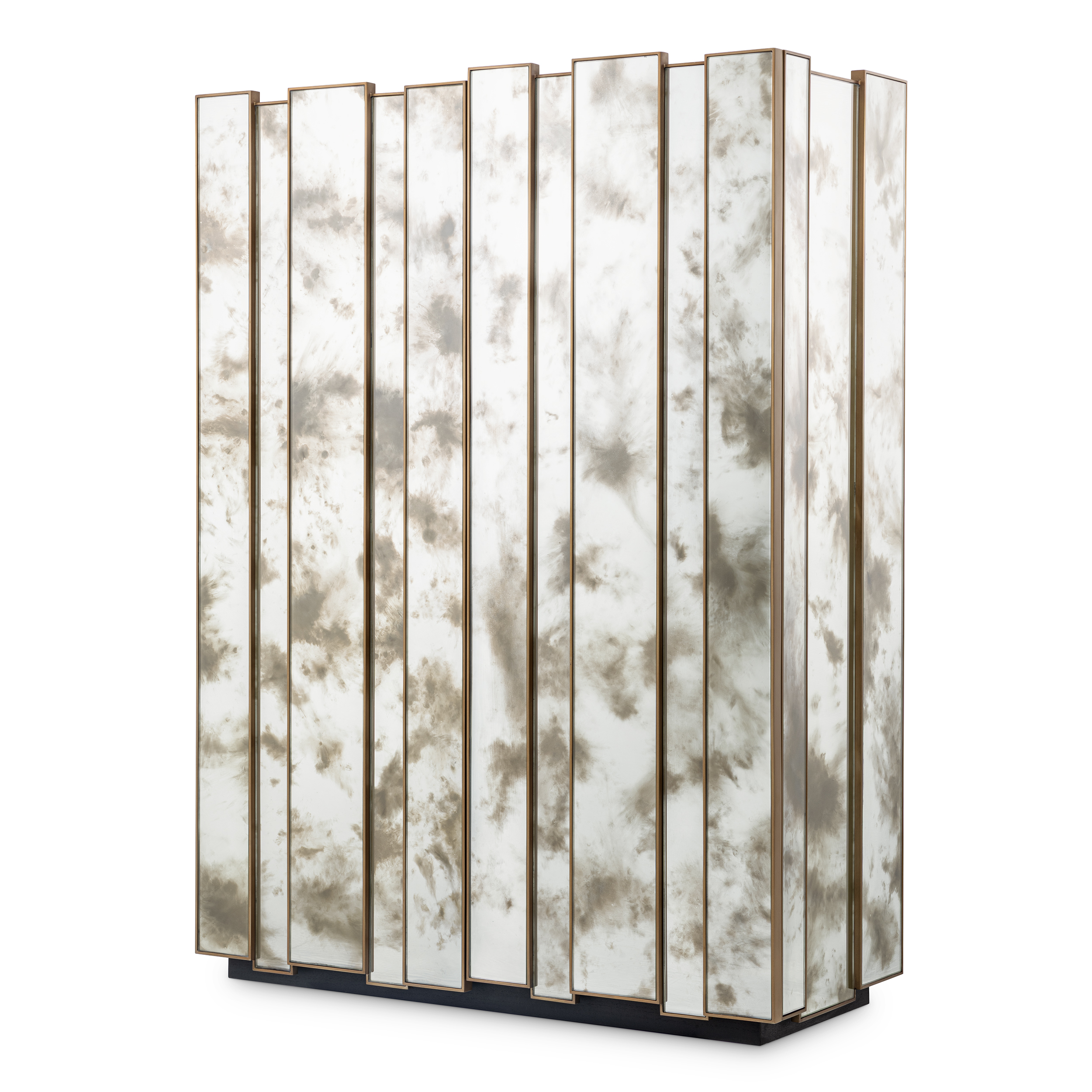 Комбинацията от антично огледално стъкло и финиш в четкан месинг придава на модела неподвластна на времето естетика и усещане за изискан блясък. Вътрешното разпределение включва просторни рафтове и отделения, които осигуряват удобно и подредено съхранение на бутилки, чаши и бар аксесоари, като същевременно позволяват стилно експониране.