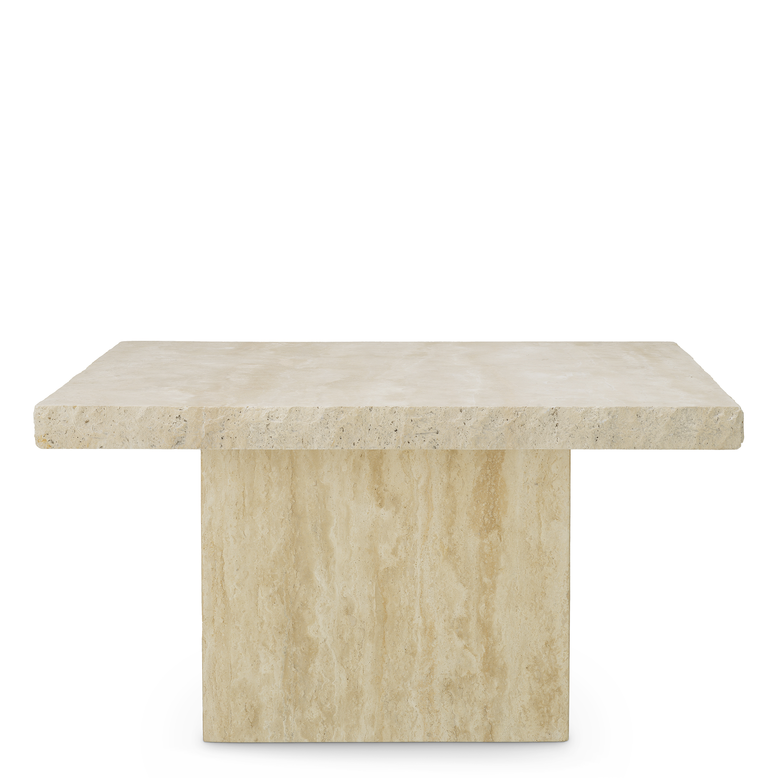 Дизайнът се отличава с масивна структура от травертин с характерна текстура и естествени несъвършенства, които превръщат всяка маса в уникално произведение. Грубите, естествени ръбове подчертават автентичния характер и създават усещане за неподправена елегантност.