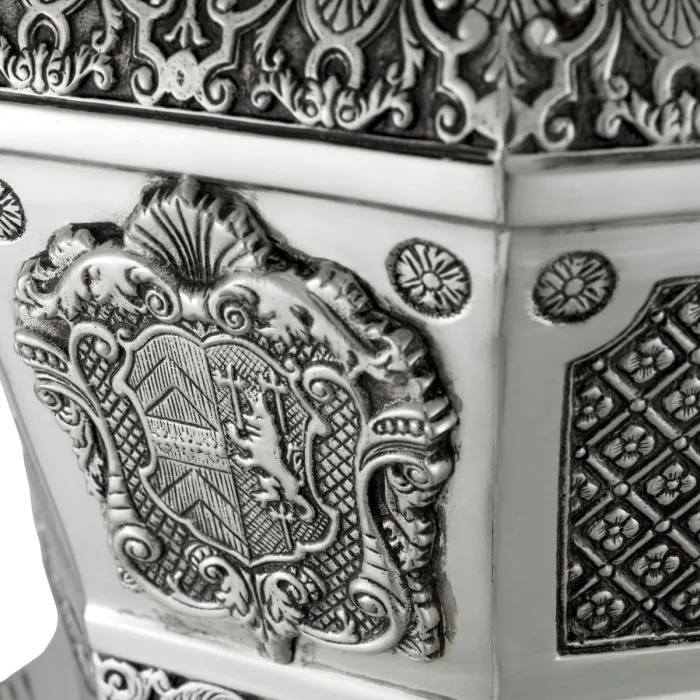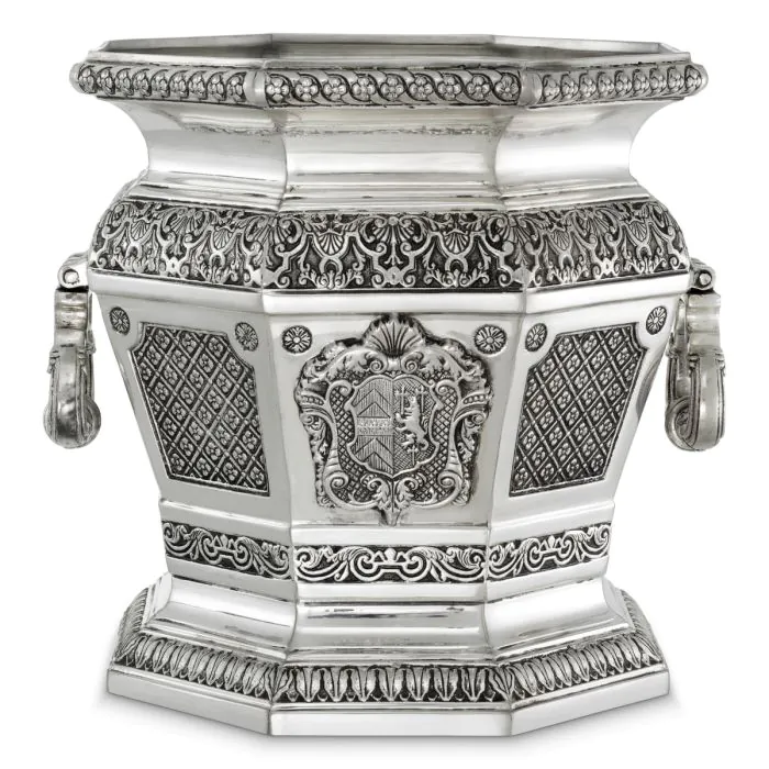 Охладителят за вино „Walpole“ впечатлява с величествен дизайн, вдъхновен от изискания английски стил на 18-ти век. Изработен от метал с антично сребърно покритие, той носи усещане за благородство и историческа стойност. Формата му напомня класическите съдове за охлаждане на вино, използвани в именията на британската аристокрация.