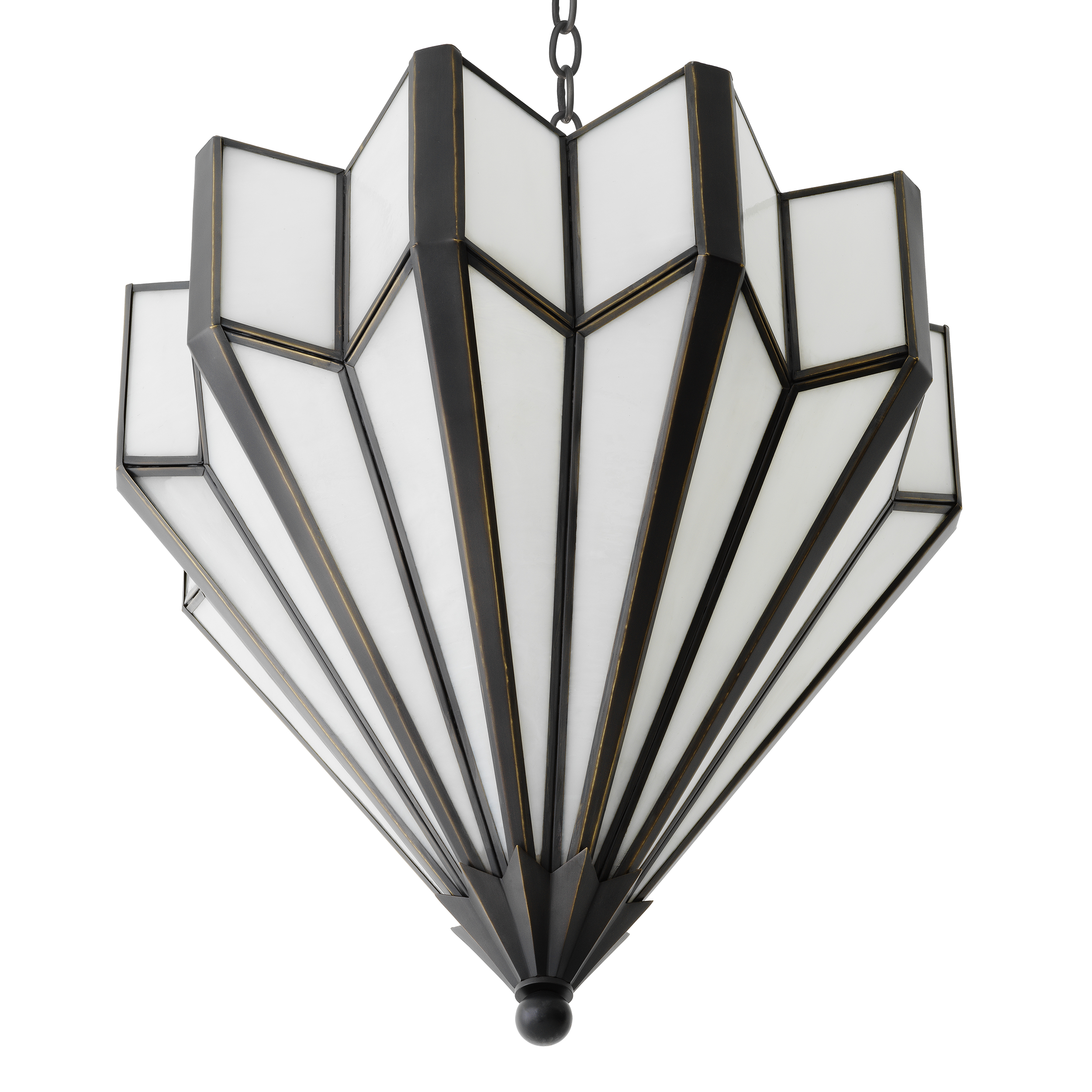 Дизайнът на полилей „Victory“ се отличава със скулптурна метална конструкция с топъл бронзов завършек и декоративни панели от стъкло с алабастров ефект. Многослойната композиция създава усещане за геометрична динамика и архитектурна елегантност, докато светлината се разпръсква меко през стъклените елементи, придавайки топла и уютна атмосфера в интериора. Балансът между метал и стъкло подчертава модерния характер на осветителното тяло и го превръща в изискан декоративен акцент.