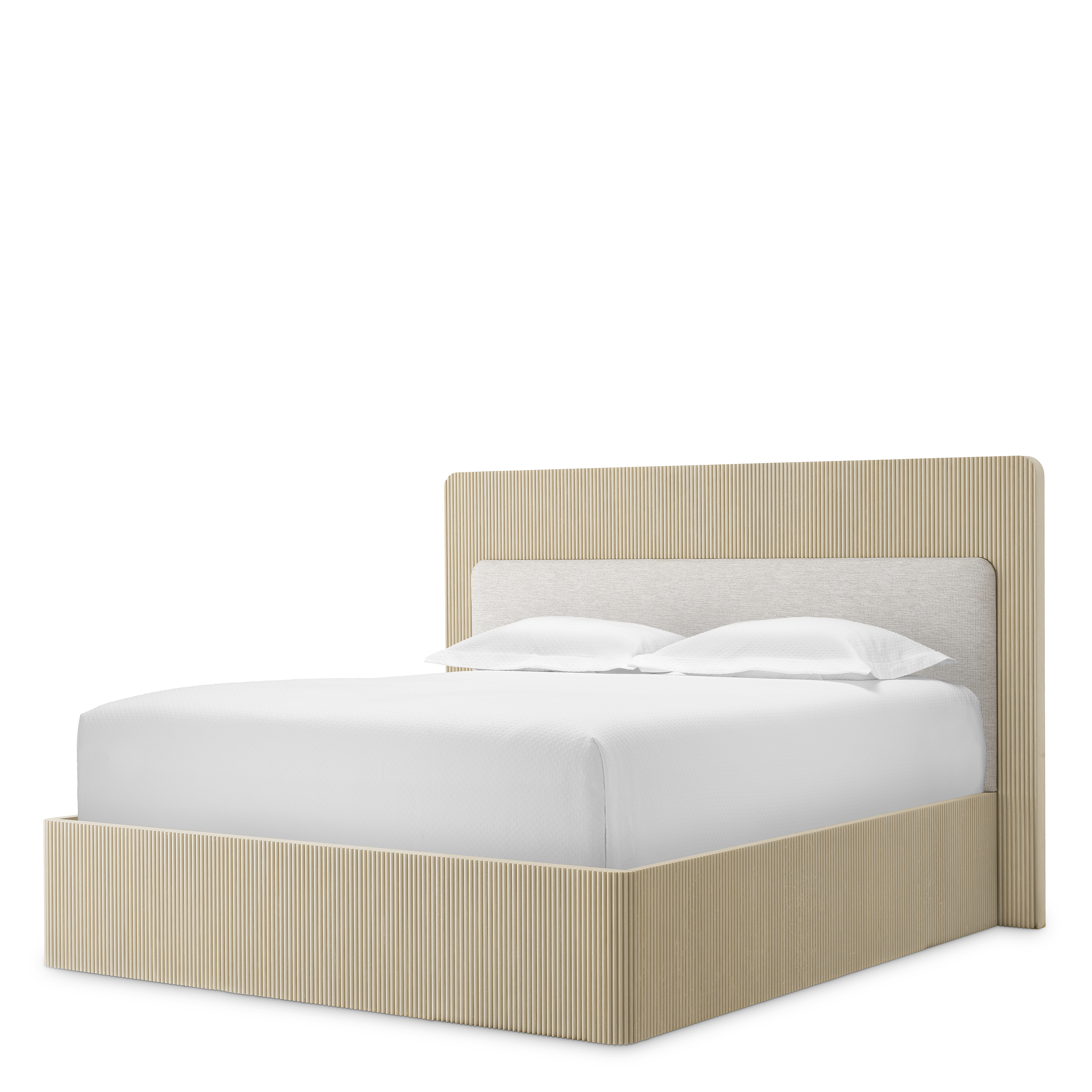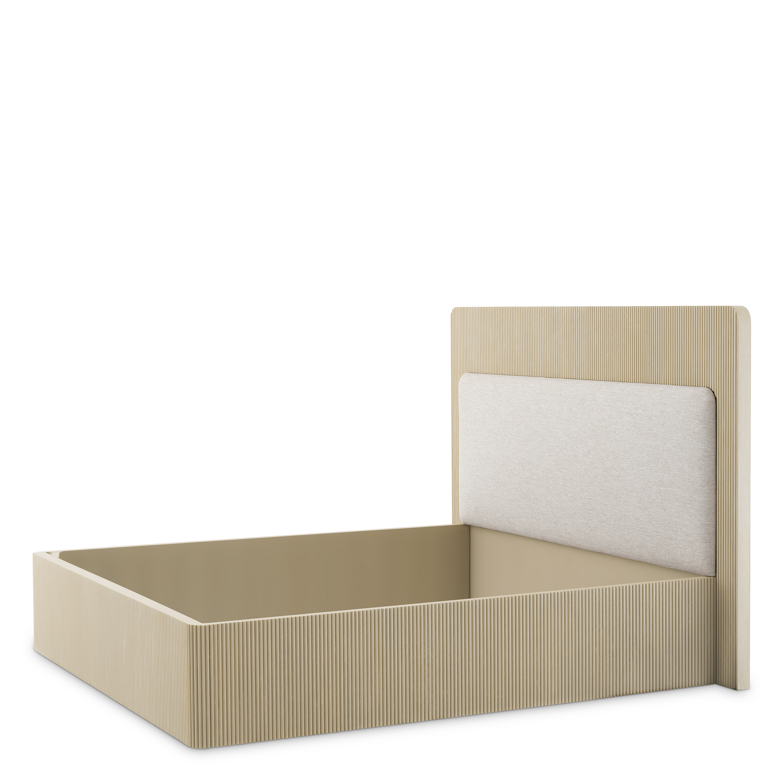 Рамката за легло „Dimitrios“ впечатлява със своята богата текстура от ребрано махагони дърво и естествена тъкан Durini, съчетани в умерени, елегантни тонове. eichholtz.com+1 Формата ѝ излъчва структурирана изтънченост и превръща леглото във визуален център на спалнята.