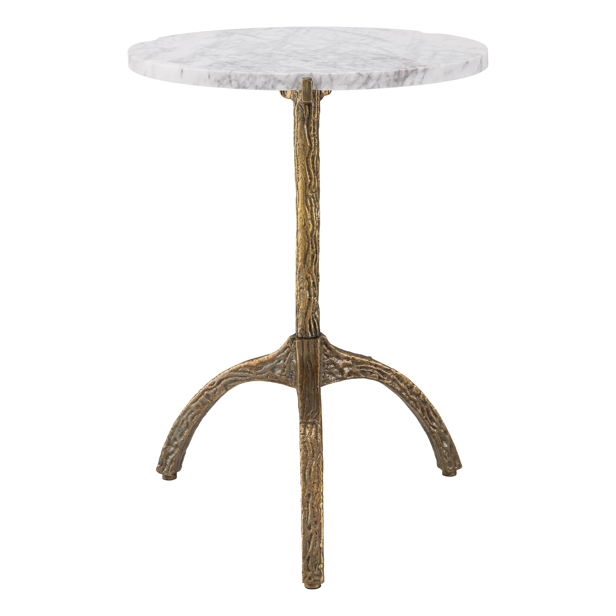 The stunning Cortina Oval Side Table is hand-casted from brass featuring a textured tripod-leg base and an oval white marble top.