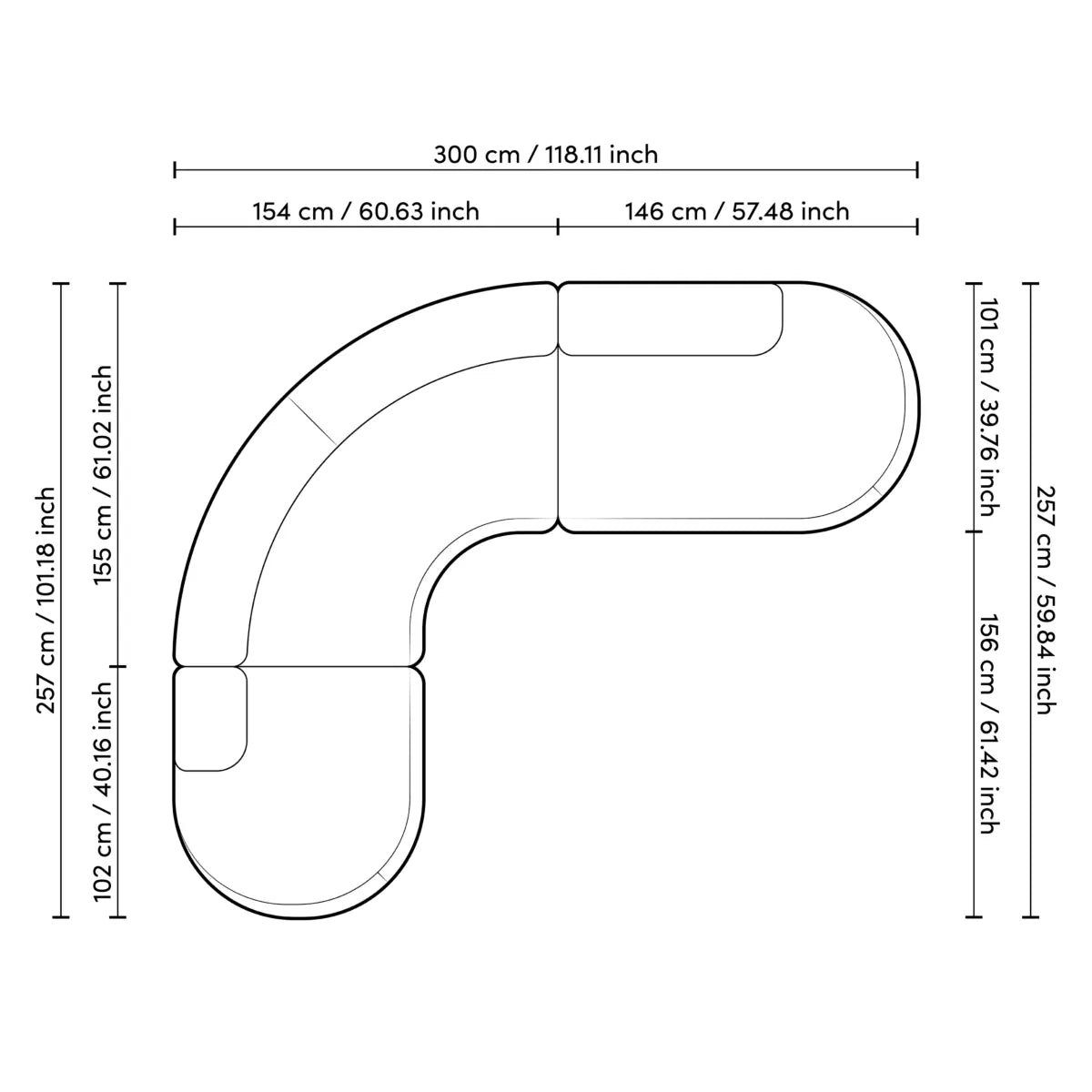 • W. 300 | D. 257 | H. 70 | SD. 72 | SH. 43 cm